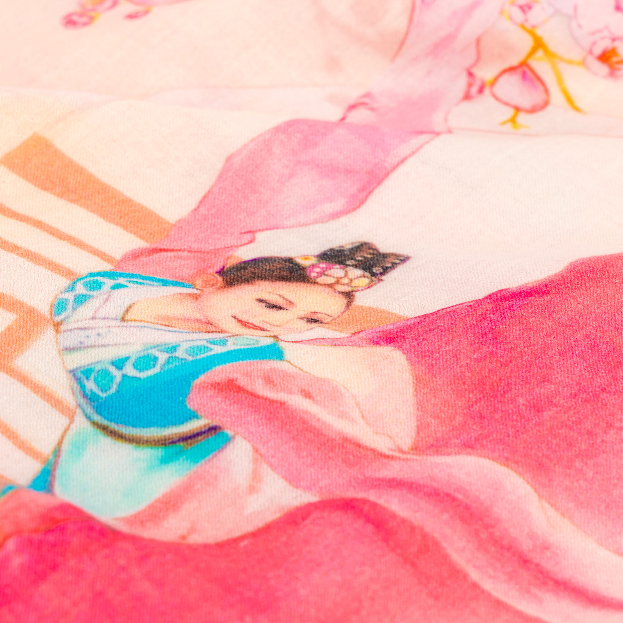 Inspired by the Shen Yun dance Courtyard Elegance as well as various water-sleeves dances seen in Shen Yun performances, this captivating scarf design takes you to a tranquil garden that breathtakingly extends from the shimmering koi pond to the towering mountain peaks and beyond. There, a maiden is seen gracing the scenery with her sleeves dancing in the air and a gentle smile on her face. With light gliding steps, she moves like the delicate petals of spring blossoms, while her long, flowing sleeves express the serene ease of a heart unbounded by the mundane world.