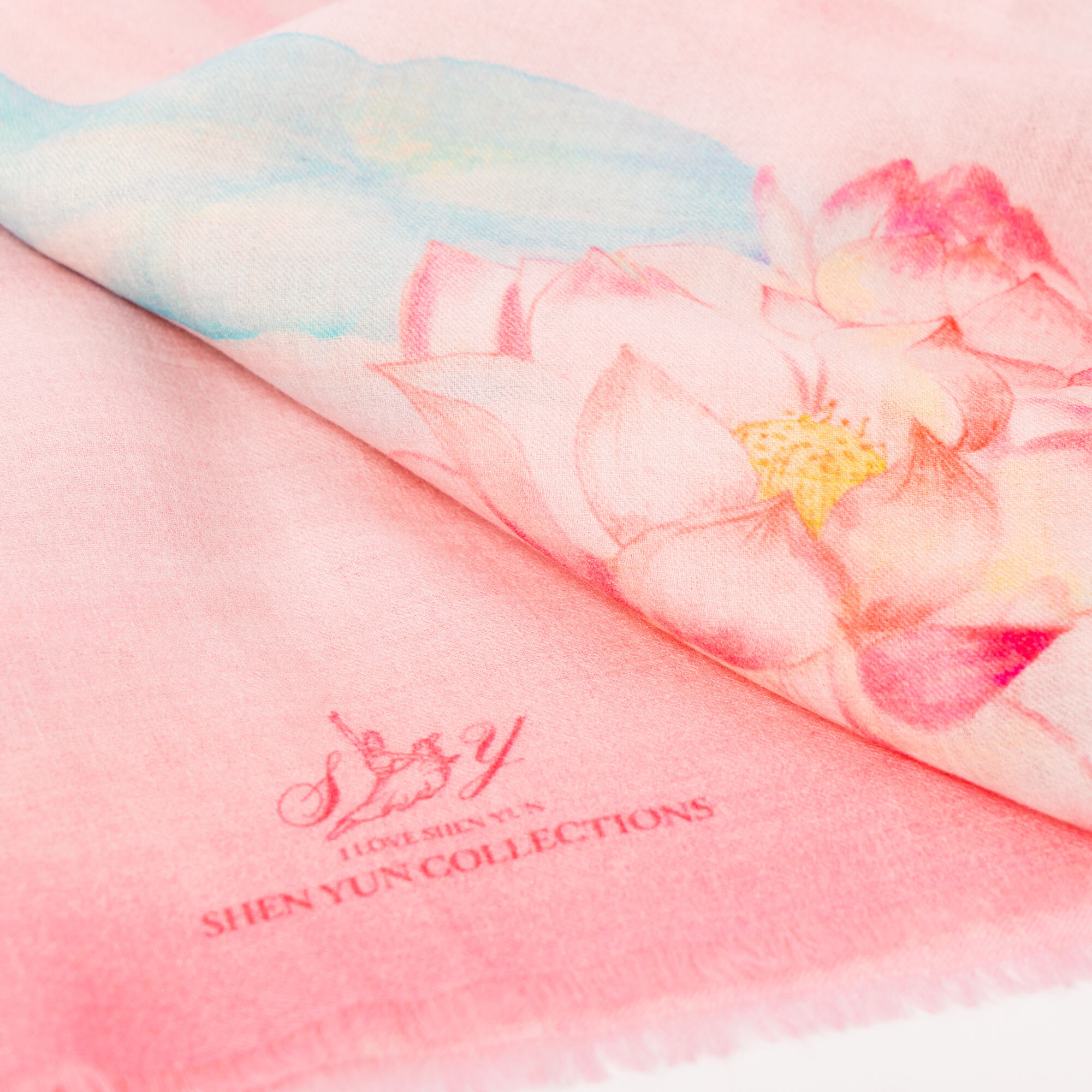 庭院深深,廊廡迴轉,碧蓮錦鯉,芳菲滿園。粼粼池水,淡淡遠山,玉人長袖,淺笑嫣然。此款長巾的靈感源自神韻節目《深院閨秀》以及神韻歷年許多以水袖為主題的舞蹈作品,恬靜安適的庭院,翩然起舞的長袖舞姿,延展心在方外的悠然。