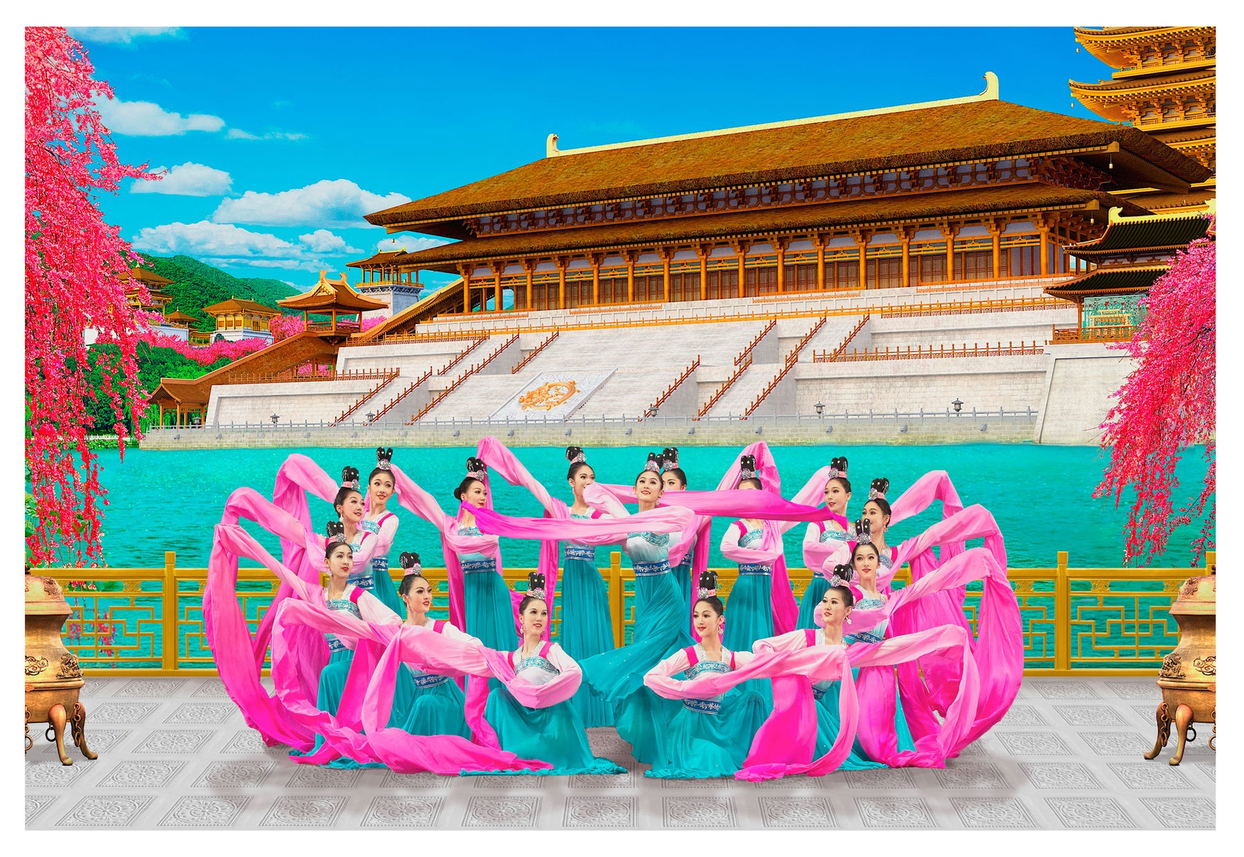 此幅畫作的場景取自神韻舞蹈作品《長袖舞唐宮》: 淼淼太液池,巍巍大明宮,盛唐多佳麗,彩袖舞春風。