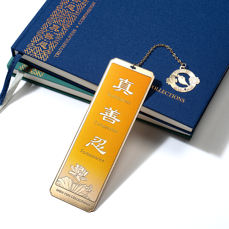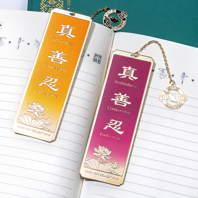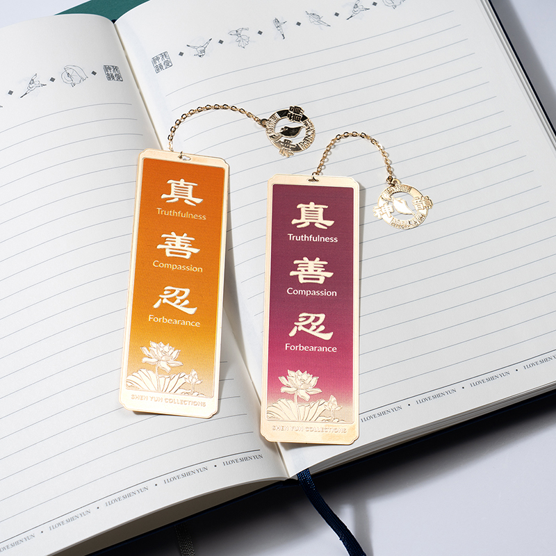 真善忍書籤-藍、橘、紫、黃 為紀念神韻舞蹈作品中所傳達的法輪大法非凡價值觀──真、善、忍。此款書籤以聖潔的蓮花 襯托優雅的字樣為設計,願「真、善、忍」照亮您的每一天,為您帶來美好的未來。